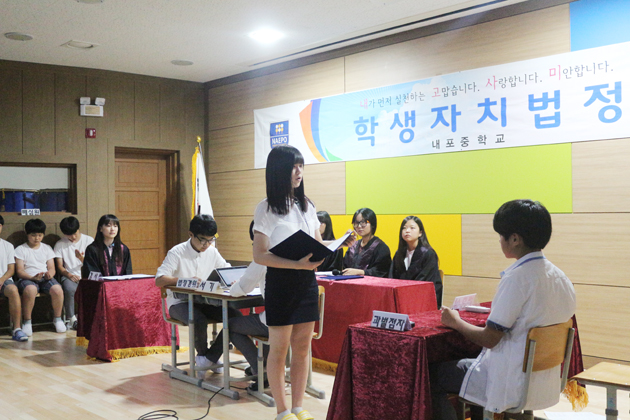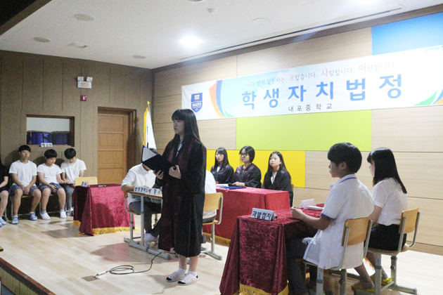 “지금부터 내포중학교 학생자치법정을 열겠습니다. 재판부 입장이 있겠습니다. 모두 일어서주십시오”