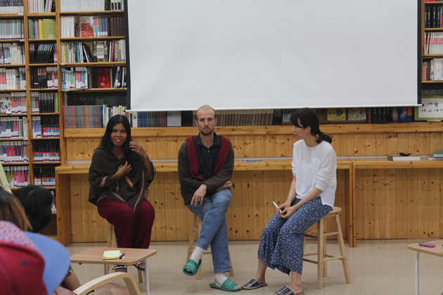 지난 8일 홍동면 밝맑도서관에 국제 생태교육 활동가와 청년, 주민 간의 교류회가 넥스트젠 코리아(NEXT GEN KOREA) 주최로 열렸다. 이날 교류회에는 넥스트젠 제노아 대표이자 태국 가이아 아쉬람의 공동 설립자인 순시아 얌위셋(Sunsia jamwiset·사진 왼쪽)과 넥스트젠 활동가이자 아시아 가이아 학교 활동가인 톰 다이터(Tom Deiters·사진 가운데)가 초청돼 주민들과 이야기를 나눴다. 김우인(사진 오른쪽) 넥스트젠 코리아 공동대표가 통역으로 나섰다. 넥스트 젠 코리아는 전 세계에 있는 국제생태마을 네트워크(GEN : Global Ecovillage Network)를 기반으로 세계의 청년들과 교류하며 경제적, 사회적, 생태적, 문화적으로 지속가능한 삶을 꿈꾸고 실험해 나가는 청년네트워크다. 순시와아 톰은 유럽과 아시아에서 어린이, 청소년, 성인을 위한 다양한 생태교육 및 생태적 감수성 프로그램을 기획하고, 직접 실행해 왔다. 이번 교류회에서는 주로 태국, 스리랑카, 인도, 네팔에서 겪은 경험을 바탕으로 생태교육프로그램과 심층생태학에 대해 이야기를 나눴다. 톰은 “생태적 붕괴, 파괴 행위가 현대 사회에 만연하다”며 “인간을 하나의 종으로 봤을 때 지구상의 여러 생물 종 중 생태 파괴자는 인간이라는 종”이라고 말했다. 그는 ‘인간은 자연을 왜 파괴하게 되었는가?’라는 질문에 대해 “인간이 자연으로부터 분리되었기 때문”이라고 원인을 지적했다. 그는 “변화가 필요한 시점에 우리가 서 있다”며 “만약 우리가 이 시점에 변화를 일으키지 않는다면 기후변화 등 자연이 그에 대한 대응을 할 것”이라고 말했다. 그는 또 “파괴행위를 일으킨 것이 인간이지만 변화시키는 것 또한 우리 인간이 할 일”이라며 행동을 촉구했다. 순시아와 톰은 생태교육프로그램을 설계할 때 머리와 가슴, 손(행동)의 연결성을 중요시한다. 순시아는 “우리는 강의 오염이 왜 중요하며, 주변 환경에 어떤 영향을 미치는 지에 대해 이론적으로 공부해왔다”며 “하지만 우리가 실제 가슴으로 강의 오염에 대해 아파하나”고 질문하며 “머리로 아는 것도 좋지만 가슴으로 느낀다면 ‘뭔가 해야겠다’는 생각으로 이어져 행동을 이끌어낼 수 있다”고 말했다. 이날 교류회에서는 청중의 요청으로 교육프로그램 중 하나를 경험해보기도 했다. 도서관이라는 공간의 특성 상 명상을 기반으로 한 프로그램을 즉석에서 시행했다. 눈을 감고 오염된 자연을 상상하고 그 안에서 고통 받는 존재가 되어보는 명상을 진행했다. 교류회에 참가한 홍기영(41·홍동면)씨는 화분에 식물을 심어놓고 매일같이 신기해하며 이야기하는 딸의 말에 무관심했던 자신의 모습을 이야기하며 “아이는 자연과 연결되어 있었는데, 자신은 그렇지 못했던 것 같다”고 고백하기도 했다. 생태교육에서는 자연을 느끼는 민감성, 감각을 살리는 연습을 많이 한다. 원초적 자연을 느낄 수 있는 곳이 한국에는 많지 않다는 질문에 톰은 “도시에 있더라도 작은 생명, 한 줌의 흙에서 민감하게 자연을 느끼는 연습을 할 수 있다”며 “하나의 자연물을 심오하고 깊이 있게 바라보는 연습을 통해 자연에 대한 민감성을 높일 수 있다”고 강조했다.