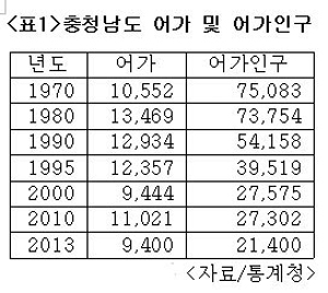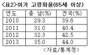 그러나 아직도 충남지역의 어가는 전남 2만1700가구에 이어 전국에서 두 번째로 많다. 한편 충남 어가인구의 고령화도 빠르게 진행되고 있다. 2010년 65세 이상 어가 인구는 29.3%였는데 2011년에는 31%, 2012년에는 32.3%, 2013년에는 35%로 증가하고 있다. 농촌 고령화 비율보다 훨씬 높다. <표2 참조>