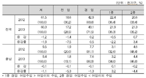 2013년 통계청 자료에 따르면 충남지역 전업 어가는 1800가구(19.1%)로 전년(1900가구)보다 5.3% 감소했다. 또한 겸업어가는 7600가구(80.9%)로 전년에 비해 1.3% 감소했으며 그중 2종 겸업어가가 4.4% 감소했다. <표3 참조> 이를 형태별로 보면 한편 충남지역의 양식어가는 7.7% 증가한 반면 어로어가는 4.3% 줄었다. 이는 선망을 이용한 해면어업의 비중이 낮아지고 김양식 등 천해 양식업이 증가하고 있는 것을 반영하고 있다. 2013년 충남지역 어업 생산량은 12만1765톤으로 전국대비 4.7%를 차지하고 있다. 어가수가 15.6%를 차지하고 있음에 비하면 가구당 생산량이 매우 낮음을 알 수 있다.<표4 참조> 전국 시도중 전남, 경남, 부산, 경북에 이어 5위를 차지하고 있다.