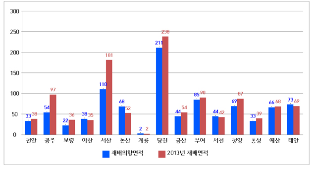 지역별로 보면 가을배추는 공주시 190㏊→114㏊(△40%), 서산시 364㏊→264㏊(△27.5%), 홍성군 305㏊→255㏊(△16.4%) 순으로 가장 큰 감소폭을 보였다. 또 가을무는 공주시 97㏊→54㏊(△44.3%), 서산시 181㏊→110㏊(△39.2%), 보령시 36㏊→22㏊(△38.8%) 순으로 감소폭이 컸다. 이처럼 재배면적이 줄어든 이유는 지난해 가을배추·무의 출하기 가격이 낮았기 때문인 것으로 보여지며 대신 콩, 들깨, 대파 등 다른 작물을 심겠다는 답변이 많았다.