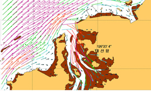 가로림만 주변의 밀물 때 조류 흐름. 썰물 때에는 이의 반대 방향.