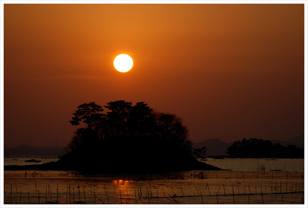 순천만 용산전망대에서 만나는 S자 코스의 일몰도 아름답지만 와온 해변에서의 일몰 또한 아름답다. 와온 해변에 카페가 있는데 그곳에서 커피 한 잔 마시면서 일몰을 만나는 것도 좋다. 앞에 있는 솔섬을 배경으로 한 일몰도 참 아름답다.