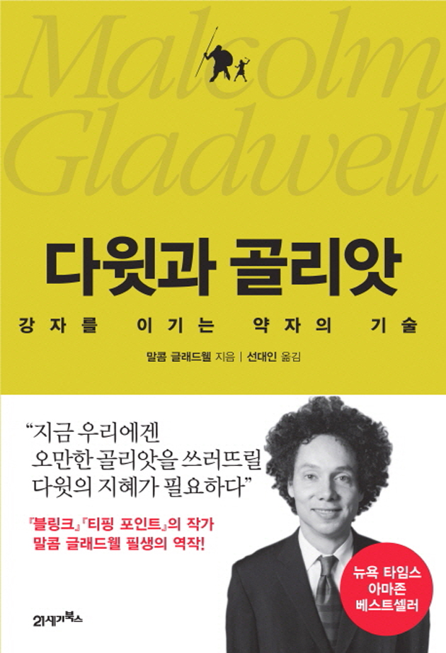 ◈다윗과 골리앗=‘아웃라이어’라는 책에서 1만 시간의 법칙을 제시한 말콤 글레드웰이 약자가 강자들을 이길 수 있었던 비밀을 소개한다. 강자의 규칙에 따라 경쟁한다면 약자의 패배는 필연적이다. 약자가 이기기 위해선 기존의 룰을 깨야한다. 약자만이 움켜쥘 수 있는 승리의 기술을 통해 인생의 어려움에 직면했을 때 어려움을 극복하고, 새롭게 바라볼 수 있는 시각을 가질 수 있도록 안내한다. 말콤 글래드웰 저/선대인 역/21세기북스/1만7000원