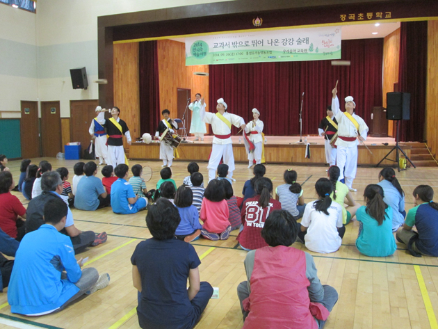 지난달 26일 장곡초등학교 체육관에서 2014 신나는 예술여행공연이 열렸다.<사진> 장곡초등학교에서 실시된 ‘교과서 밖으로 뛰어나온 강강술래’ 프로그램은 길놀이, 판굿, 소원천 쓰기, 지경다지기, 길쌈놀이, 강강술래 등의 순서로 진행됐으며 홍성영농조합원들과 장곡초교 학생이 참여해 즐거운 시간을 보냈다.