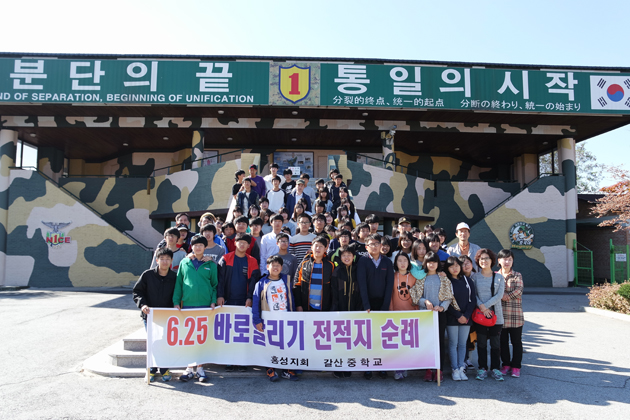갈산중학교(교장 전종현)는 6·25참전동지회 홍성지회(회장 이봉래)의 지원으로 지난 15일 전교생과 교사, 참전동지회 홍성지회 회원들과 함께 분단의 현장인 경기도 파주시에 있는 임진각, 제3땅굴 등으로 나라사랑 통일 안보체험학습을 다녀왔다. 저작권자 © 홍주일보 무단전재 및 재배포 금지 서용덕 기자 다른기사 보기 페이스북 카카오톡 URL복사 기사공유하기