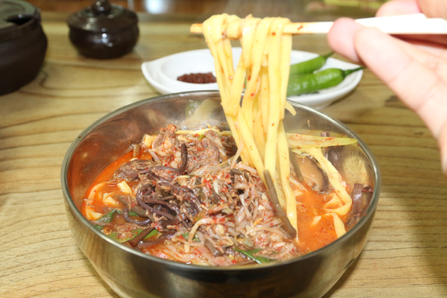 지 않지만 날씨가 쌀쌀해지면 아는 분들은 주저 없이 육개장칼국수를 주문할 정도로 인기가 높다. 고기와 숙주나물을 푸짐하게 넣어 얼큰하고 시원하게 끓여낸 육개장과 칼국수면의 조합은 언뜻 생각하면 어색할 수도 있다. 육개장에 칼국수는 밥을 말아 먹는 것과는 다른 색다른 맛을 보여준다. 가격도 일반 칼국수