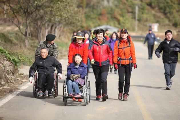 바깥출입이 어려운 중증 장애인들이 모처럼 집을 떠나 오서산의 아름다운 풍광을 즐기며 행복한 하루를 보냈다. (사)충남지체장애인협회 홍성군지회(회장 복천규)는 지난 13일 장곡면 광성리에서 오서산을 오르는 장애인 휠체어 등반대회를 개최했다.