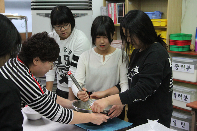 다문화봉사단을 지도하는 박신자 갈산중 특수교사는 “지역사회와 함께하는 봉사활동을 통해 학생들이 자연스럽게 지역사회의 구성원으로 정체성과 보람을 느끼게 하기 위해 시작했다”고 설명했다. 지난 15일 토요일, 이날은 봉사단원 가운데 5명이 사랑의 빵을 만들어 전달하기 위해 홍주제과기술학원에 모였다.