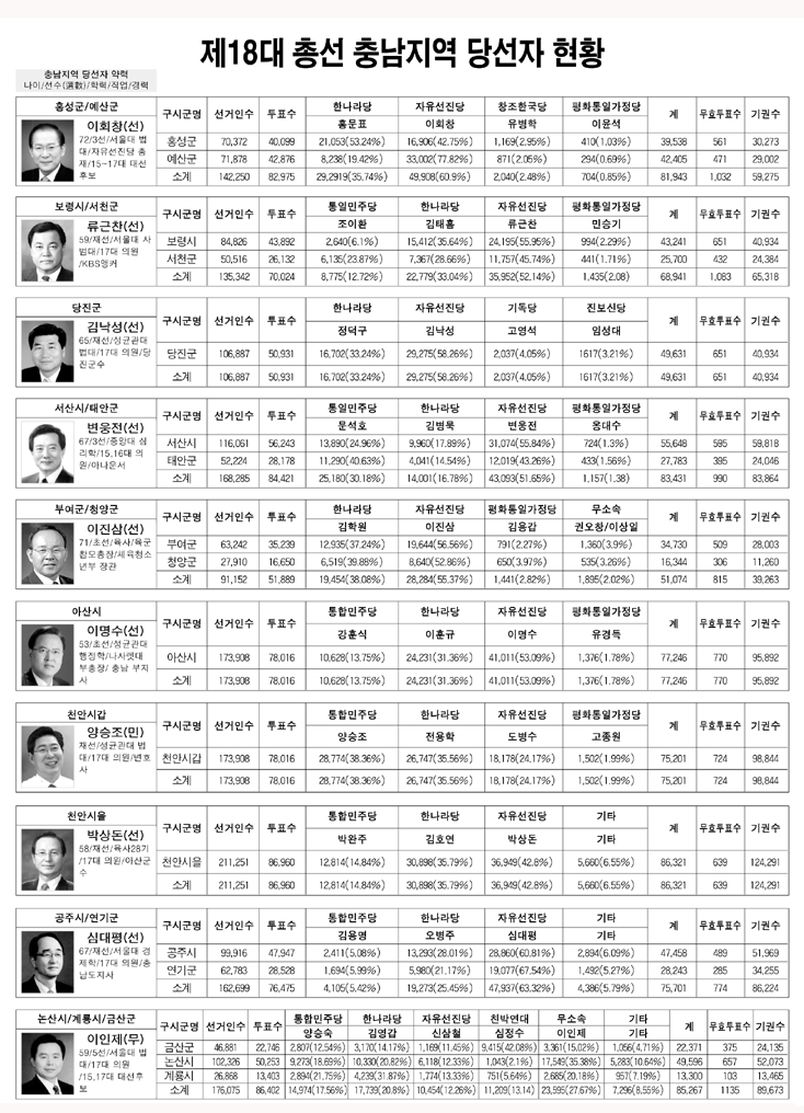 또한 충남에서 이회창 총재가 예산 홍성에서 압도적인 지지율로 당선된 것을 비롯해 심대평(공주 연기) 이명수(아산) 박상돈(천안을) 류근찬(보령 서천) 변웅전(서산 태안) 이진삼(부여 청양) 김낙성(당진) 등 8개 선거구를 장악했다.