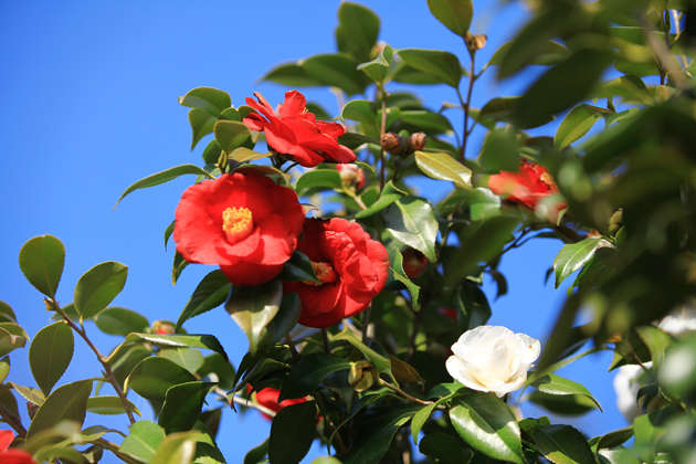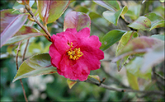 한겨울에도 반들반들한 윤기의 잎이 매력인 탓에 웬만한 가정에서 쉽사리 볼 수 있는 꽃나무이지만 산다화(山茶花·사진 아래)란 품종과 구별해 내기엔 쉽지 않을 것이다. 다 자라면 10여 미터나 되는 큰 교목인 동백나무<사진 위>와 다 커도 5미터를 넘지 않는 산다화는 같은 차나무과이지만 꽃피는 시기와 형태에서 차이를 보이기 때문에 구별이 된다고 할 수 있다.