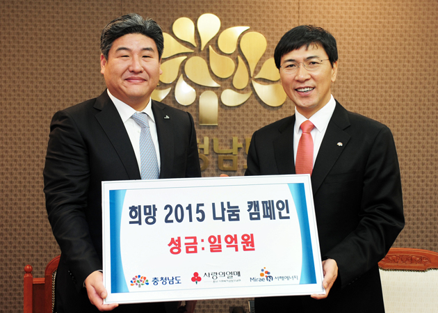 ㈜미래엔서해에너지(대표 김영진)는 지난 17일 도청을 방문, 불우이웃돕기 성금 1억 원을 기탁했다. 연말을 맞아 불우한 이웃을 돕기 위한 ‘희망2015나눔캠페인’이 전개되고 있다. 저작권자 © 홍주일보 무단전재 및 재배포 금지 서용덕 기자 다른기사 보기 페이스북 카카오톡 URL복사 기사공유하기