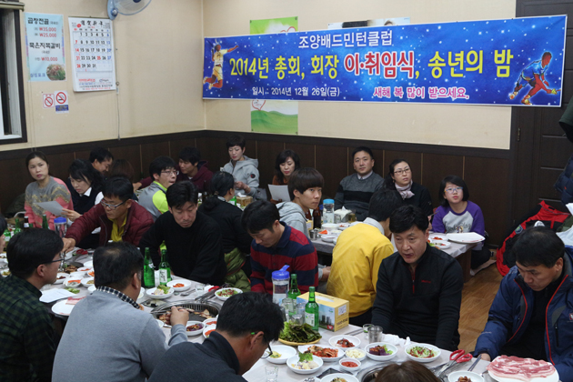 조양배드민턴클럽(이하 조양클럽)은 지난달 26일 홍성읍 싱싱포크에서 이용선 홍성군배드민턴연합회장을 비롯해 회원 등 50여명이 참석한 가운데 ‘2014년 총회 및 회장 이·취임식, 송년회’를 가졌다.<사진> 이날 김상현 회장이 이임하고 제6대 클럽회장에 배봉영 회장이 취임했다. 이임한 김 회장에게는 회원 화합과 클럽 발전에 기여한 공로로 감사패가 수여됐다.