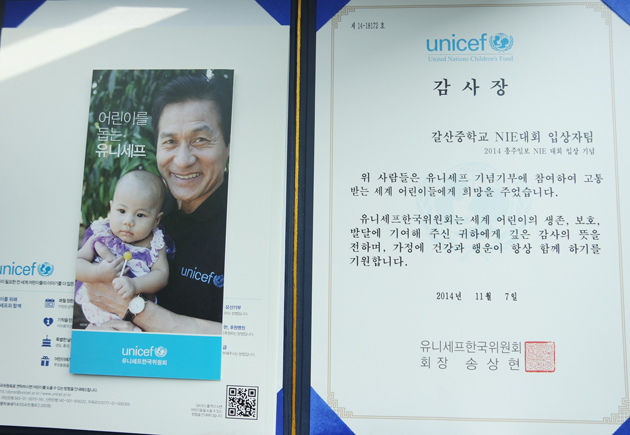 유니세프는 굶주림과 전염병에 시달리고 있는 세계 각국의 어린이의 생존과 보호 발달을 위한 협력과 지원사업을 하는 NGO단체다. 갈산중의 수상팀은 상금을 의미있게 사용하고 기부 문화를 실천할 수 있는 방안을 모색하던 중 전옥자 지도교사를 비롯한 5팀의 학생들 의견을 모아 상금의 10%인 10만원을 모아 유니세프한국위원회에 기부했다. 이에 유니세프 한국위원회로부터 감사장을 받았다.
