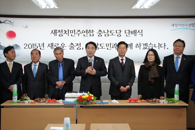 새정치민주연합 충남도당(위원장 박수현 국회의원)이 지난 2일, 당사 회의실에서 2015년 단배식을 진행했다. <사진> 박수현, 양승조 국회의원과 지방의원, 핵심당원 등 100여명이 참석한 이 행사는 새해 덕담, 떡 나눔 행사 등의 순서로 진행되었다.