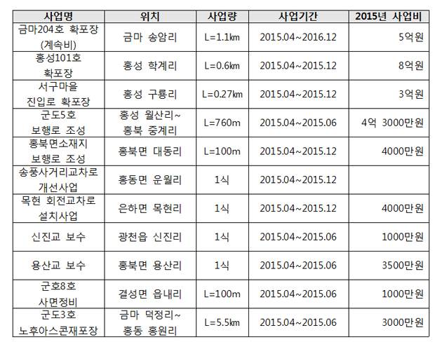 이 외에도 홍동면 운월리 송풍사거리교차로 개선사업과 은하면 목현리 회전교차로 설치사업, 광천읍 신진리 신진교 및 홍북면 용산리 용산교 보수, 결성면 소재지인 읍내리를 관통하는 군도8호 사면정비(총연장 100m), 금마면 덕정리와 홍동면 홍원리를 잇는 군도3호선 노후아스콘재포장(총연장 5.5㎞) 등의 사업을 추진한다.