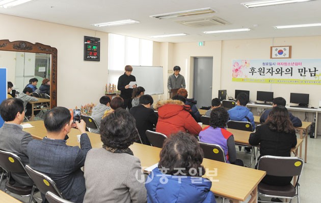 청로일시청소년쉼터(소장 이철이)는 지난 28일 홍성군다기능복지센터 내 청소년쉼터 후원자들을 초청해 ‘후원자와의 만남’ 행사를 개최했다. 이날 행사에는 입소학생들을 비롯해 홍성청사모(청소년을 사랑하는 모임) 곽은숙 회장, 청소년쉼터 멘토·멘티 봉사단 박금자 회장, 미래로봉사단 박종진 회장 등 50여명이 참석했다.