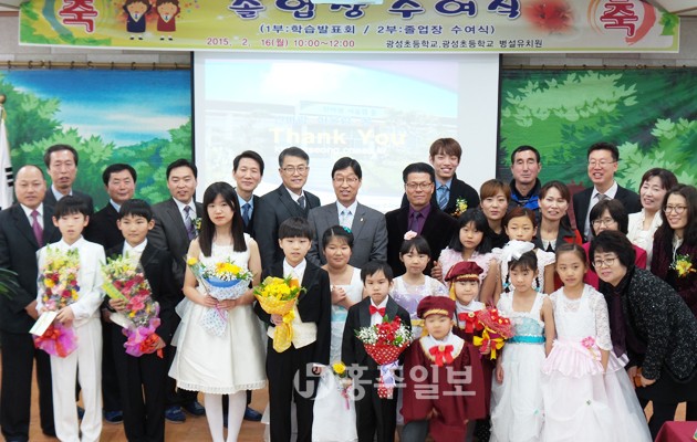 나영광 교장은 “부모님과 선생님 그리고 선배들의 고마움을 잊지 말고 모교를 오래도록 기억하길 바란다”고 말했다. 광성초는 1964년 갈산초 동성분교로 시작해 1966년 광성초로 승격됐다. 그동안 2083명의 졸업생과 병설유치원 297명의 졸업생을 배출했다. 광성초는 3월 1일자로 갈산초로 통폐합될 예정이며 재학생 8명 중 7명은 갈산초로 1명은 서산 고북초로 편입된다. 한편 나영광 교장은 다음달 1일자로 갈산초 교장으로 발령받아 광성초 재학생과 함께하게 됐다.서용덕 기자