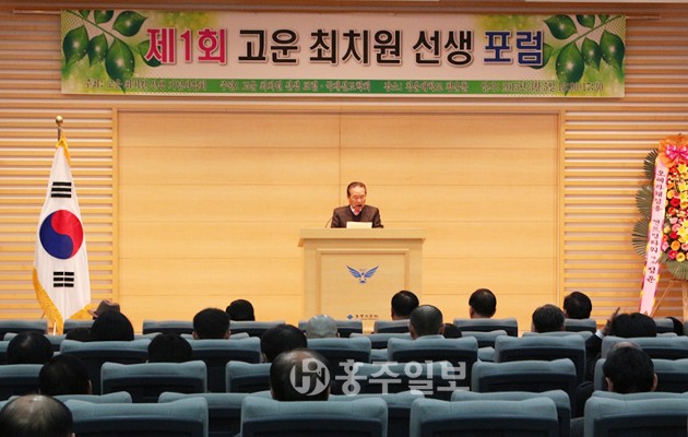 고운최치원선생기념사업회(회장 이종근·이하 기념사업회)는 지난 5일 청운대 청운홀에서 ‘제1회고운최치원선생포럼’을 개최했다. 기념사업회가 주최하고 군이 후원한 이날 포럼에는 이종근 회장, 김석환 군수, 홍문표 국회의원을 비롯한 관계자 100여명이 참석했다. 이번 포럼에서 대표를 맡은 한서대 김현문 교수는 대회사를 통해 “오늘 포럼이 최치원 선생의 족적과 업적을 다각도로 조명하고 학문적으로 정립하는 시간이 됐으면 한다”고 말했다.