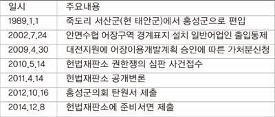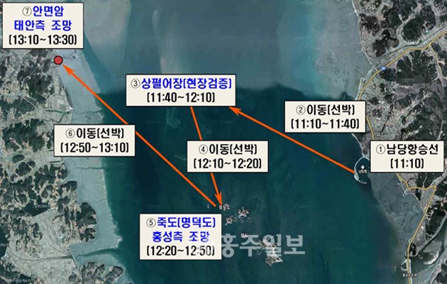 홍성군에 따르면 지난 2010년 홍성군이 헌재에 제기한 권한쟁의 심판을 담당하는 재판관 등 6~7명이 오는 24일 현장검증을 실시하기로 결정했다고 지난 17일 밝혔다. 권한쟁의 심판은 지난 2011년 공개변론과 지난해 12월경 준비서면 제출 이후 심리와 최종선고만을 남겨둔 상태이나 현장검증은 이번이 처음이다. 헌재는 “천수만의 현황 특히 간조시 상펄어장 현황 및 해역 부분 경계획정에 필요한 거리, 이용상황 등 일체의 사정을 판단하기 위해 현장검증을 결정하게 됐다”고 밝힌 것으로 알려졌다. 이번 현장검증에는 헌재 재판관과 홍성과 태안 군 관계자 및 양군 어업인 대표 등이 참석한 가운데 상펄어장을 비롯해 홍성군 명덕도에서의 거리와 태안군 안면암에서의 거리, 어장이용상황 등을 종합적으로 검증한다.