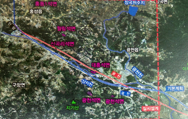 그러나 홍성 신성~보령 주포 구간은 기본설계노선 당시 홍주미트 앞 이던 광천 역사 위치가 실시설계노선에서는 광신철재 앞 야산으로 변경 이후 지역주민의 반발과 민원이 이어져 사업이 진전되지 않고 있다. 특히 지난해부터는 실시설계 노선이 지나는 광산에서 석면이 검출된다는 사실이 알려지며 광천주민들의 반발이 거세게 일었다. 철도시설공단과 기본설계노선을 지지하는 주민들의 첨예한 대립으로 해결의 실마리가 풀리지 않는 가운데 철도시설공단은 지난 3일 본지와의 전화인터뷰를 통해 더 이상의 노선변경은 없으며 하반기에는 착공에 들어가겠다고 밝혔다.