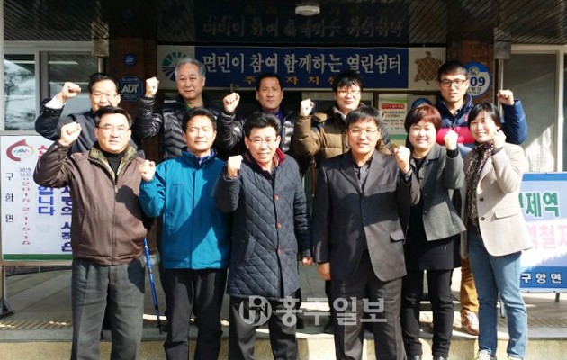 구항면은 홍성읍에서 서남쪽에 위치하고 있으며, 면의 북쪽으로 백월산이 있고 중앙은 보개산이 자리잡고 있다. 구항면정 최일선에는 김영만 면장을 중심으로 총무, 주민지원, 민원, 산업 등 4개 분야 등 15명이 포진돼 있다.<사진>