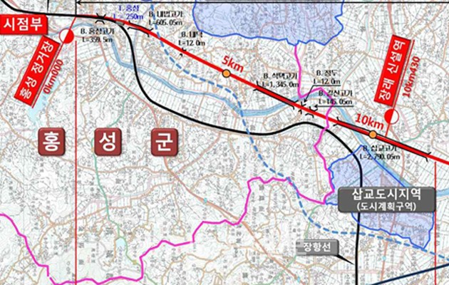 한편, 서해선복선전철은 서해안권 교통수요를 분담하고 경부선축에 집중된 화물의 우회수송 체계를 구축하는 국가기간철도망 사업으로 2018년도까지 총 3조8280억 원을 투입해 총 연장 90.01㎞ 철도를 구축하는 사업이다. 홍성군의 편입 토지는 국유지 193필지 4만5391㎡, 사유지 558필지 32만3667.4㎡로 총 751필지 36만9058.4㎡다.