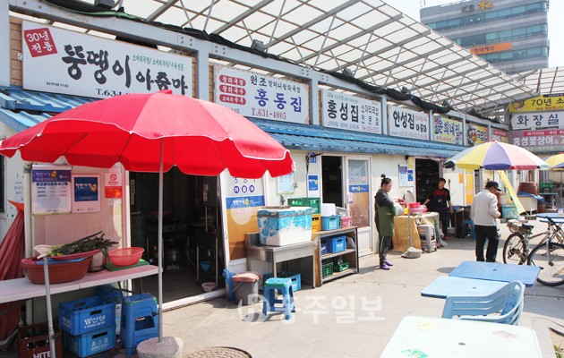 20여년전부터 전통시장에서 장터국수를 팔아온 홍성집 김진예 씨는 “밥값이 비싸면 장사꾼이나 시장 손님들이 먹기 힘드니까 계속 낮은 가격을 받으며 팔고 있다”고 말했다. 전통시장내 또 다른 착한 식당 골목은 신상가 서울누비와 문전성시 카페가 있는 골목에 위치하고 있다. 길 양쪽에 상가를 비롯해 식당들이 자리 잡고 있다. 이곳은 보리밥을 비롯해 국밥, 국수 등 서민적인 음식이 주종이다. 장터밥집은 각종 나물이 푸짐하게 넣은 보리 비빔밥과 잔치국수를, 홍초식당은 돼지머리국밥을, 신성식당(구 삼양식당)은 국수를 각각 3000원에 판매하고 있다. 저렴한 가격이 입소문을 타면서 장날이 아닌 평일에도 사람들이 많이 찾는다.