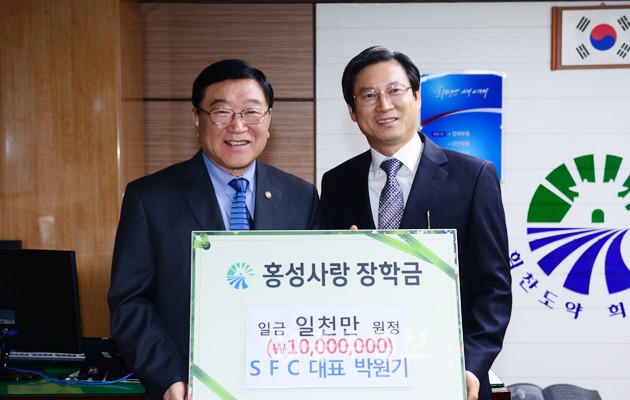 ▲ 구항면 소재 태양광 백시트 및 특수필름전문생산업체인 에스에프씨(SFC) 박원기 대표이사는 지난달 31일 군청을 방문해 홍성사랑장학회에 1000만원을 전달했다. 저작권자 © 홍주일보 무단전재 및 재배포 금지 홍주일보 다른기사 보기 페이스북 카카오톡 URL복사 기사공유하기