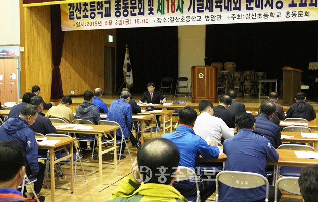 갈산초등학교총동문회(회장 최광환)는 지난 3일 갈산초 병암관에서 ‘갈산초등학교총동문회 및 제18차 기별체육대회 준비사항 보고회’를 개최했다. 이날 최광환(47회) 회장, 총동문회 임원, 각 기수별 이사, 100주년 편집위원 등 50여명이 참석한 가운데 개교 100주년 기념사업 추진계획, 개교 100년사 편집위원회 구성, 제18차 기별체육대회 소요예산 심의, 총동문회 재무관리 결산보고 등의 안건을 논의했다.
