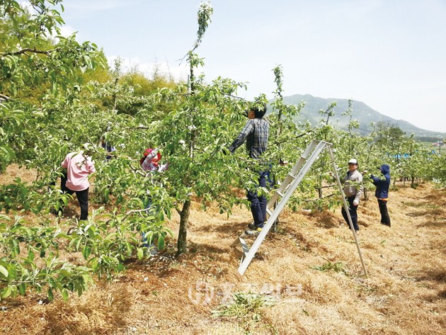 금마면사무소(면장 조권형)와 군청 기획감사실 직원 20여 명은 지난 6일 금마면 용당마을에 위치한 한 과수농가를 찾아 사과나무 꽃 솎아내기 작업 등 농촌일손돕기에 나서 구슬땀을 흘렸다.