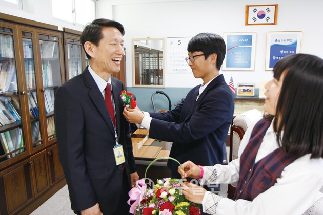 스승의 날을 맞아 갈산중학교 전종현 교장에게 3학년 박철순 학생과 김서현 학생이 카네이션을 달아주고 있다. 저작권자 © 홍주일보 무단전재 및 재배포 금지 장윤수 기자 다른기사 보기 페이스북 카카오톡 URL복사 기사공유하기
