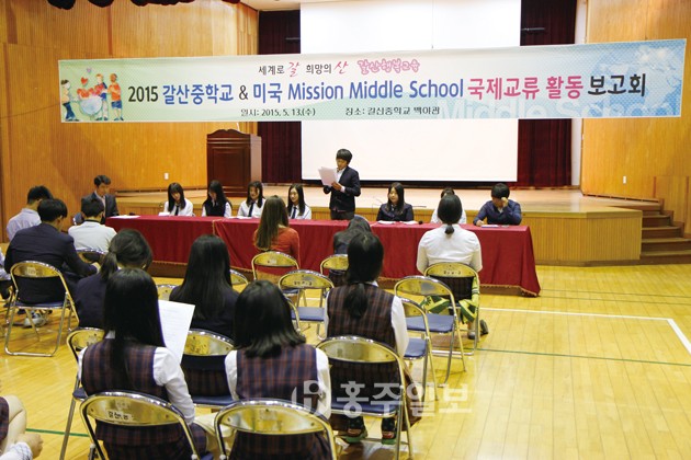 이날 보고회는 지난 2013년 갈산중이 동문들로 구성된 백야장학회의 후원으로 미국 리버사이드 교육청과 교환학생 관련 MOU를 체결하고 이에 따라 국제교류활동을 가진데 따른 것으로, 시청각 자료 감상, 학교장 인사 및 내빈 격려사, 슬라이드 자료 감상, 교류활동 발표 및 질의응답 등의 순으로 진행됐다. 특히 갈산중은 ‘세계로 갈 희망의 산’이라는 학교 브랜드 가치를 실현시키기 위한 희망인재 육성을 위해 이번 국제교류사업을 추진했으며, 성과로 지난해 1월 24일부터 2월 4일까지 12일간 갈산중 학생 2명 및 학생인솔 교장 1명, 교사 1명이 미국 미션중학교를 방문하고 홈스테이 등 문화탐방을 한 바 있다. 이어 지난해 6월 5일부터 16일까지 12일의 일정으로 미국 미션중학교 학생 4명 및 학생인솔 교장 1명, 교사 2명이 갈산중을 방문하고 결연 학생의 집에서 홈스테이와 문화체험을 가졌다. 또 이번 보고회는 지난 1월 23일부터 2월 5일까지 13일의 일정으로 갈산중 학생 6명이 방문한 것을 보고하는 자리로, 이번 국제교류활동에 참가한 한 학생은 직접 영어로 보고문을 준비해 와 눈길을 끌기도 했다.