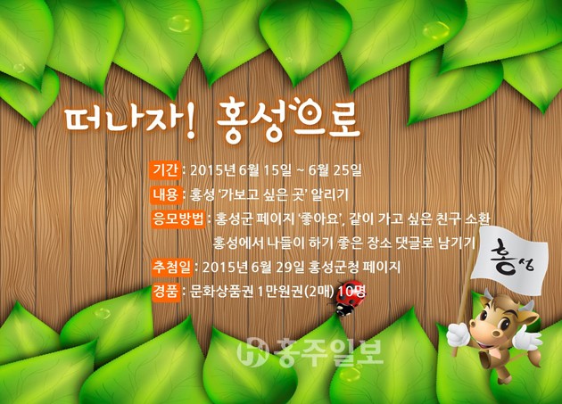 군은 홍성을 알리기 위해 ‘떠나자! 홍성으로’란 제목의 이색적인 행사를 오는 25일까지 진행해 당첨자 10명을 선정, 문화상품권 1만 원 권 2매씩을 우편으로 발송할 예정이다. 참가를 원하는 사람은 홍성을 방문해 본인이 가 본 곳을 홍보하며 군청 페이스북 페이지에 ‘좋아요’를 클릭하거나 게시물 ‘좋아요 및 공유하기’를 하면 된다. 또한 군을 알리고 싶은 친구를 태그하거나 홍성에서 가보고 싶고, 나들이하기 좋은 장소를 댓글로 남긴 참가자들을 대상으로 오는 29일 추첨이 진행된다. 현재 군 페이스북은 갈산토기 체험장, 홍성의 정기가 넘치는 백월산 및 용봉산을 다녀간 등산객들이 페이스북 친구들에게 소개하는 등 큰 호응을 얻고 있다. 군은 충남의 수부도시로 코레일과 서해금빛열차 협약식을 갖고 열차 관광객을 위해 기존의 기(氣)찬 홍성 해피버스투어와 연계해 체험 및 체류형 관광상품을 운영하고 있으며, 주말에 외지 관광객 방문 수가 증가하면서 군을 다양한 방법으로 알리기 위해 이번 행사를 마련했다.