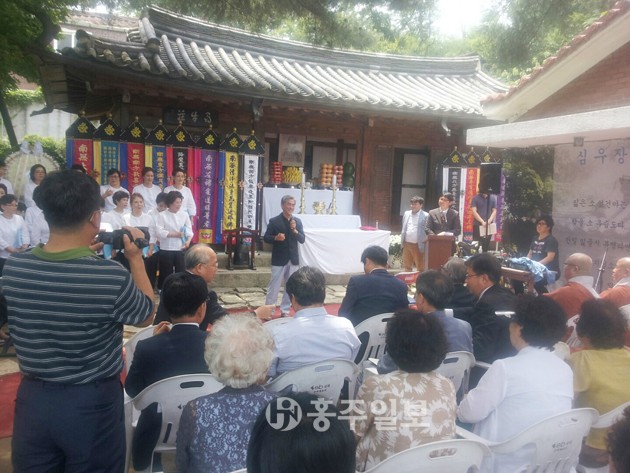 홍성의 대표적인 독립운동가이자 시인이었던 만해 한용운 선사 71주기 다례제가 지난달 29일 서울시 성북동 심우장에서 재단법인 선학원과 성북문화원 주최 국가보훈처 후원으로 봉행됐다. 올해 다례제는 만해 선사의 출생지인 충남 홍성군과 수행처 강원 인제군, 말년을 보낸 서울 성북구 등 3개 지방자치단체가 모두 참여해 의미를 더했다. 심우장은 1944년 6월 29일 만해 선사가 입적한 곳으로 성북문화원은 매년 이곳에서 추모다례제를 봉행해왔다. 이날 다례제에는 홍성군 이승우 문화관광과장, 장사익 씨를 비롯해 선학원 이사장 및 이사 등 임원 등 100여명이 참석했다. 다례제에 이어 부대행사로 시낭송과 국악공연을 비롯해 추모예술제의 일환으로 토크 콘서트, 뮤지컬 등이 펼쳐졌다. 한국을 대표하는 소리꾼이자 홍성 출신인 장사익 씨는 “홍성 출신으로 만해 선사와 같은 고향이라는 점에 긍지를 갖고 있다”며 노래 ‘나 무엇이 될까 하니’를 선보였다.