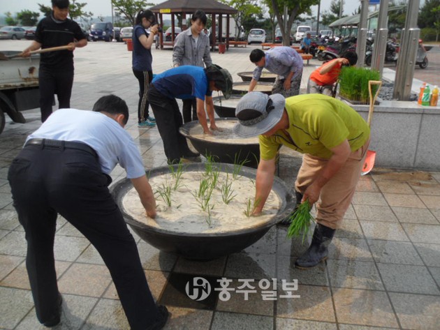 홍성역(역장 주호용)은 1일 홍성풀무농업기술학교 교직원 및 학생들과 함께 역광장 대형화분 5개에 모를 심는 행사를 가졌다. 이날 행사는 철도이용객들에게 농촌의 정취를 느낄 수 있는 볼거리를 제공, 자연친화적인 이미지를 제고하고 홍성군민들에게는 우리 쌀, 우리 것을 사랑하는 마음을 심어주기 위해 마련됐다. 주호용 홍성역장은 “모를 심고 가꿔 벼가 자라는 아름답고 이색적인 홍성역을 만들기 위해 많은 도움을 주신 풀무농업기술학교 교직원 및 학생들에게 깊은 감사를 드린다”고 말했다. 이어 “이를 통해 자연친화적인 녹색철도의 이미지가 제고될 것으로 기대한다”고 말했다.