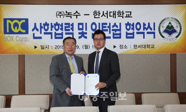한서대와 지역 우수기업인 (주)녹수는 지난달 29일 한서대 본관 접견실에서 산학협력 협약을 맺고 인적, 물적 교류를 통한 공동발전 및 교육진흥을 위해 함께 노력하기로 했다. 이 협약에서 한서대 함기선 총장과 (주)녹수의 고동환 대표이사는 모두 8개항에 달하는 상호협력 조항에 서명했다. 양 기관은 연구, 자문, 디자인, 기술개발 등에 관한 정보공유, 한서대 학생의 인턴십과 연수, 세미나, 취업, 장학금 지원, 산업체 직원의 재교육과 맞춤교육, 산업체 인사의 초빙강의 등이 포함됐다. 이 협약에 따라 한서대 학생들이 오는 8일부터 12월까지 6개월 간 (주)녹수의 인턴 사원으로 채용된다.