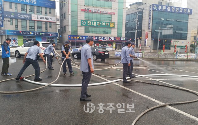 ▲ 홍성읍의용소방대(대장 장영진) 지난 15일 홍성 하상복개주차장에서 의용소방대원 30여 명이 참여해 시가지 물청소를 실시했다. 저작권자 © 홍주일보 무단전재 및 재배포 금지 홍주일보 다른기사 보기 페이스북 카카오톡 URL복사 기사공유하기