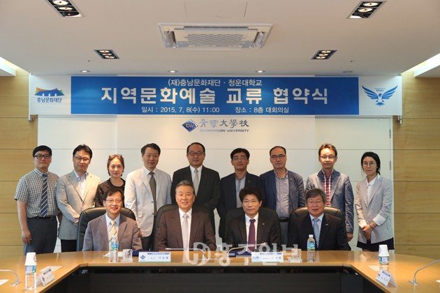 청운대학교(총장 이상렬)는 8일 홍성캠퍼스 대학본부 대회의실에서 충남문화재단(대표이사 이종원)과 ‘지역문화예술 교류 협약’을 체결, 재능기부 활동 등을 협력하기로 했다. 저작권자 © 홍주일보 무단전재 및 재배포 금지 홍주일보 다른기사 보기 페이스북 카카오톡 URL복사 기사공유하기
