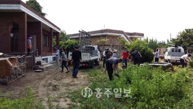 구항면과 (주)동양하우징 직원들이 독거노인의 집수리와 제초작업을 하고 있다.