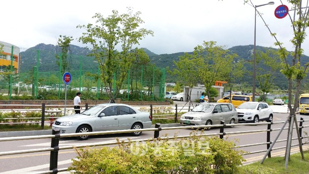 내포초등학교(교장 김민영) 학생들의 등하교 길이 교문 앞 불법 주정차 차량들로 위험하기 그지없다. 학교 앞 불법주정차는 비단 내포초교 뿐만 아니다. 그러나 내포초교의 경우는 교문앞 도로가 과속방지를 위한 굴곡선으로 돼 있어 주정차 차량들이 지나는 차량들의 시야를 크게 가려 사고 위험이 매우 높다. 특히 학교 정문 앞은 굴곡선 가운데 불룩 튀어나온 부분이어서 횡단보도를 건널 경우 불법 주차 차량이 있으면 시야가 가려 주행 차량이 근처까지 다가와도 보이지 않는다. 지난 10일 오후 2시30분쯤 교문 앞 횡단보도 좌우로 승용차들과 학원 차량 20여 대가 늘어서 있었다. 왕복 2차선 가운데 불법주정차 차량들이 차선 하나를 가로막아 교행이 불가능한 가운데 도로가 구불구불해 구간에 따라 횡단보도가 통째로 보이지 않기도 했다. 어린이들이 어른의 도움 없이 횡단보도를 건너기엔 너무도 위험해보였다. 등교시간 1시간 사이에 학교 앞을 통행하는 차량만도 200대에 달한다고 한다. 초등학생 760여 명과 병설유치원생 100여 명이 등하교하기에 너무도 위험해 학교 측은 등교시간인 오전 7시 30분부터 교사와 녹색어머니회, 안전지킴이 등 4명을 동원, 불법 주정차를 막고 학생들의 안전 등교를 돕고 있다. 그러나 등교시간이 끝나면 어김없이 불법주정차 차량들이 몰려들고 덤프트럭이나 레미콘트럭 등 대형 차량들이 통행금지 구역인데도 휘젓고 다니기 일쑤이고 하교시간에는 학원차량들까지 줄을 서 더욱 혼잡해진다. 김민영 교장은 “하교시간에도 저와 교감선생님, 교사들이 교대로 나와서 지켜 다행히 아직까지 사고는 없었다”며 “경찰과 군청 등에 수차례 건의하고 인근 공사현장사무소에 협조를 구했지만 해결의 실마리를 찾지 못 하고 있다”고 하소연했다.