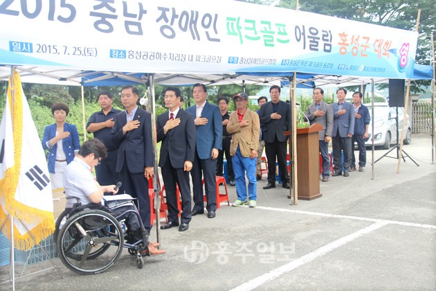 충남장애인골프협회(회장 안진식) 주최, 홍성 푸른파크골프동호회(회장 고용호)가 주관한 ‘2015 충남 장애인 파크골프 어울림 홍성군대회’가 지난달 25일 홍성하수종말처리장 내 파크골프장에서 개최됐다. 이번 대회는 지난달 19일부터 20일까지 부여군에서 개최가 예정됐던 제20회 충남장애인체육대회가 메르스 여파로 취소된 이후 개최된 첫 도내 행사로, 각 시군에서 많은 관계자가 참석해 화합의 한마당을 가졌다. 이번 대회는 총 14개의 세부종목으로 나눠 진행됐으며 서산시가 1위 2종목, 2위 4종목, 3위 5종목으로 종합 1위를, 당진시가 1위 4종목, 2위 2종목 3위 1종목으로 종합 2위를, 천안시가 1위 2종목, 2위 1종목, 3위 2종목으로 종합 3위를 차지했으며, 홍성군은 1위 1종목, 2위 1종목, 3위 1종목으로 순위 입상을 하지 못하는 아쉬움을 남겼다. 이번 대회에는 홍성·예산 홍문표 국회위원을 비롯한 여러 내빈이 참석한 가운데, 홍성군장애인후원회에서는 후원금을 전달해 자리를 빛냈다. 고용호 홍성 푸른파크골프동호회장은 “장애인파크골프 동호회 활성화를 위해 전문지도자를 배치하고 이를 통해 회원들의 기량 향상을 도모할 것”이라며 “소규모 대회 개최 계획 등을 위해서도 노력하겠다”고 밝혔다.