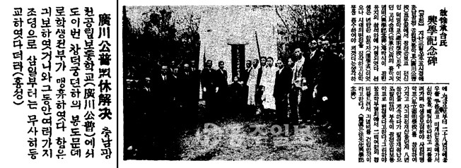 광천공립보통학교 맹휴 관련기사('동아일보', 1926년 5월 5일)(왼쪽)와 서승태 흥학기념비 제막식 사진('동아일보', 1935년 11월 9일).