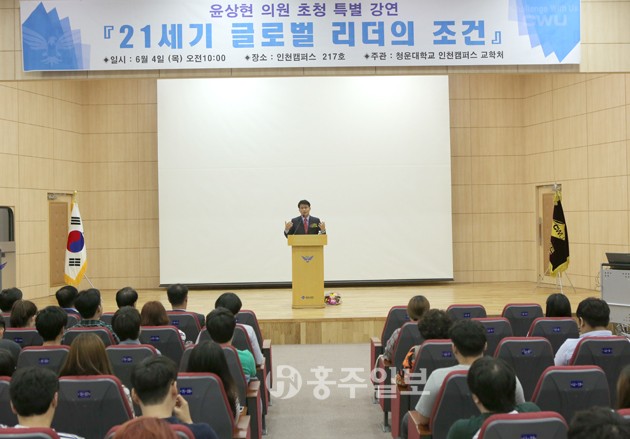 청운대학교(총장 이상렬)는 지난 4일 윤상현 청와대 정무특보(국회의원)를 초청, 재학생 350여 명을 대상으로 특강을 실시했다. 이날 특강에서 윤 특보는 ‘21세기 글로벌 리더의 조건’을 주제로 강연을 펼쳤다. 윤 특보는 강연에서 “리더는 포용성, 인간적인 매력, 확고한 목표를 가져야 한다”며 “신념과 열정을 가지고 끝까지 포기하지 않고 달려간다면 누구나 리더가 될 수 있다”고 말했다. 또한 “과거와 현재 그리고 미래가 만나는 가장 좋은 방법은 책을 읽는 것이며 독서는 나 자신을 돌아볼 수 있는 좋은 기회가 될 것”이라고 강조했다.