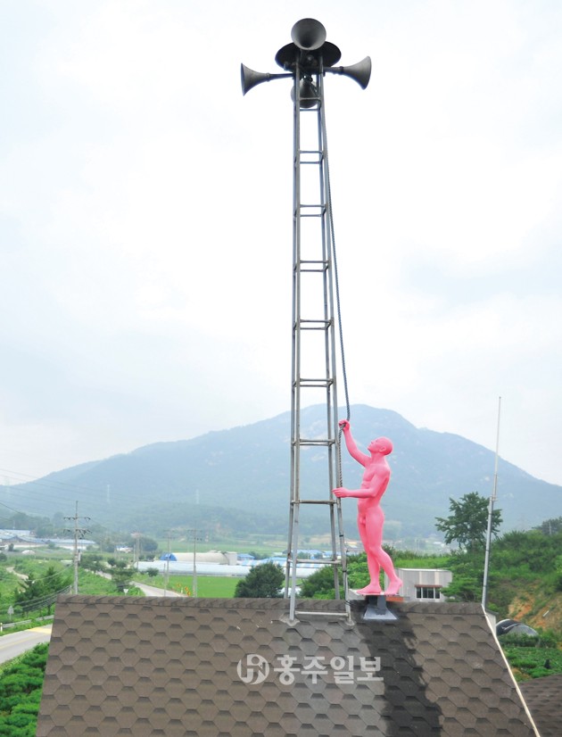 마을의 리더들을 형상화한 ‘종 치는 사람’은 강렬한 핑크색이 돋보이며 관습적인 색의 편견보다는 심미성과 가시성에 주안점을 두어 강렬함을 추구하고 있다는 평가다. 또 ‘종 치는 사람’은 마을주민 모두의 배려와 격려, 협동과 소통으로 이응노 마을사업의 또 다른 시작과 변화, 발전을 ‘핑크빛 열애’처럼 꿈꿀 수 있게 형상화했다는 설명이다 작가는 작품을 제작하기에 앞서 마을이장을 비롯한 거버넌스 주최자들을 만나 제작방법과 재료 등 충분한 아이디어 회의를 거쳐 조형적 완성도 및 관리와 안정성까지 고려해 설치했다. ‘종 치는 사람’을 마을의 상징물로 형상화한 홍상식 작가는 목원대학교 미술대학 및 동 대학원을 졸업했고, 현재 목원대에 출강하며 한국구상조각회, 한국부조협회, 대전조각가협회, 목원조각회 회원으로 활동하고 있다. 홍 작가는 “고암 이응노 화백과 각별한 인연이 된 듯하다”며 “대전 고암미술문화재단의 후원에 힘입어 파리에서 작업을 할 수 있게 됐고, 홍성 이응노마을 사업과의 인연 속에 마을의 상징물을 설치할 수 있게 돼 매우 기쁘다”고 말했다.