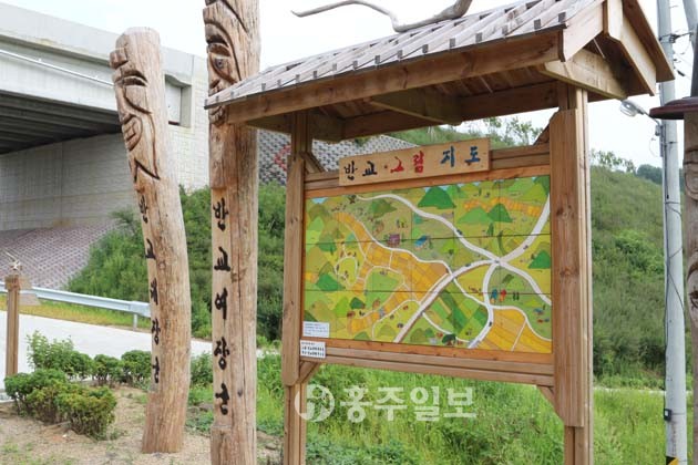 농촌의 작은 마을이 미술과 공예로 주목을 받고 있다. 홍동면 신기리 반교마을은 41가구에 불과한 작은 마을로 주민 중 65세 이상 고령이 45%를 차지하고 독거노인도 16가구나 된다. 특히 여느 마을 달리 집들이 한 곳에 모여 조성되지 않고 골자기마다 흩어져 있어 마을 주민들이 한 자리에 모이기도 어려운 환경이다. 그러나 2012년부터 살기 좋은 희망마을 만들기 사업에 참여하며 마을의 분위기가 변해갔다. 특히 마을 할머니들은 그림을 배우고 할아버지들은 목공을 배우고 마을 환경을 스스로 아름답게 가꿔가면서 마을에 활기가 돌기 시작했다. 반교마을은 초입부터 방문객의 눈길을 사로잡는 것이 있다. 나무로 만든 장승과 그림으로 그린 마을지도인데 모두 마을 주민들이 힘을 모아 만든 것이다. 할머니들은 마을의 지도를 그리고 할아버지들은 지도를 걸 안내판과 장승 등을 만드는 등 모두 주민들의 힘으로 만든 것이다. 모양부터 시골의 정서를 느낄 수 있다. 안내판 위에는 예부터 집안을 지켜주는 수호신으로 알려진 구렁이를 깎아서 올렸고 장승에는 못 쓰는 화분과 고무통 뚜겅 등을 사용해 갓을 씌워 주는 등 재미있는 모습이 지나는 이들의 발길을 멈추게 한다.