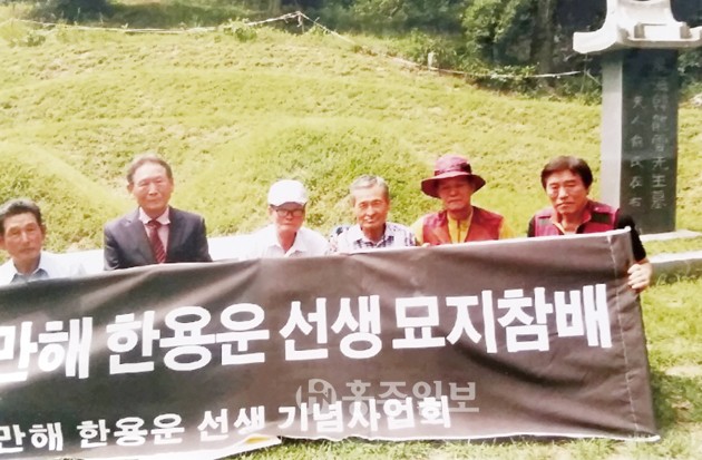 (사)독립투사만해한용운선생기념사업회(회장 이소용‧이하 기념사업회)는 지난 22일 임원, 회원 등 20여명이 참석한 가운데 서울 망우리 한용운 선사 묘소를 찾아 참배했다. 이날 기념사업회는 독립투사인 한용운 선사의 애국, 충절의 뜻을 되새기기 위해 묘소를 찾아 잡초 제거 등 묘지를 돌보고 참배했다. 이소용 회장은 “한용운 선생의 묘가 국립묘지가 아닌 망우리에 안장되 있는 것이 개탄스럽다”며 “생가지에 한용운 선생과 선생의 선조의 묘를 생가지에 이장하고 관리해야 할 것”이라고 말했다. 한편 기념사업회는 갈산중‧고등학교에 지역의 독립운동가인 김좌진 장군과 한용운 선사의 정신 기리길 수 있는 독립운동 길 등을 설치해 학생들의 귀감으로 삼자고 제안했다.