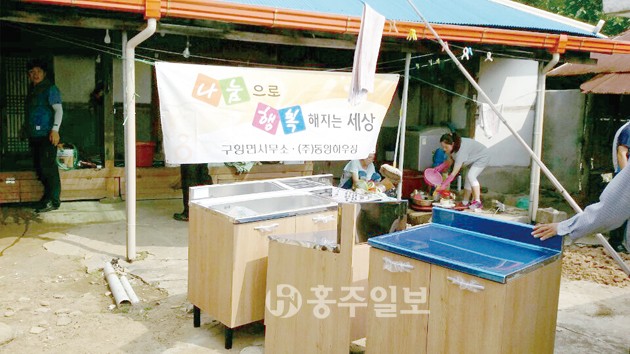 구항면(면장 김영만)과 ㈜동양하우징(대표 명근영) 직원들은 24일 홀로 사는 중증 장애인의 주거 환경 정비와 집수리 활동(싱크대 및 부엌 천장 보수, 도배 및 장판 교체 등)을 펼쳤다. 저작권자 © 홍주일보 무단전재 및 재배포 금지 홍주일보 다른기사 보기 페이스북 카카오톡 URL복사 기사공유하기