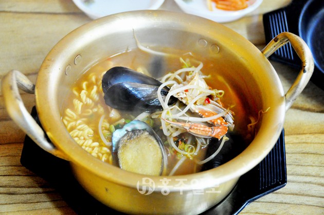 이곳에 사는 주민들은 대부분 어업에 종사하고 있는데 마을 앞에는 전복, 참돔 양식장이 있다. 이곳이 개발되면서 이곳에도 카페와 횟집 등이 생겨나 관광객들에게 먹거리를 제공해주고 있다. 주민이 30여명이 산다는 만지도에 도착해 먼저 눈에 보이는 홍해랑 카페에 들어갔다. 핸드드립으로 커피를 내려주는 아름다운 바리스타 아가씨가 우리를 반겨줬다. 커피를 주문하고 아내는 옛날 과자를 한 봉지 샀다. 이 과자는 여행하면서 간식으로 유용하게 사용됐고 이곳에서는 아이스크림이나 물도 살 수도 있다. 여행책자까지 냈다는 여 사장님과 잠시 이야기를 나누고 아침식사를 하지 않았다고 하자 이모네 해물라면을 추천해줬다.