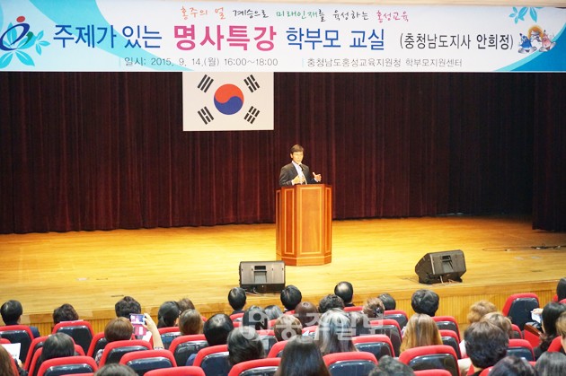 홍성교육지원청(교육장 조인복)은 지난 14일 홍성문화원에서 안희정 충청남도지사를 초청해 ‘2015 주제가 있는 명사특강 학부모교실’을 개최했다. 이번 명사초청 학부모교실에는 관내 학부모 및 교직원 등 250여 명이 참석한 가운데 진행됐다. 이번 학부모교실은 학부모의 교육 참여 및 기회 확대와 자녀교육 역량 강화, 건전한 교육관 정립 등을 통해 가정교육의 내실화를 위해 마련됐다.
